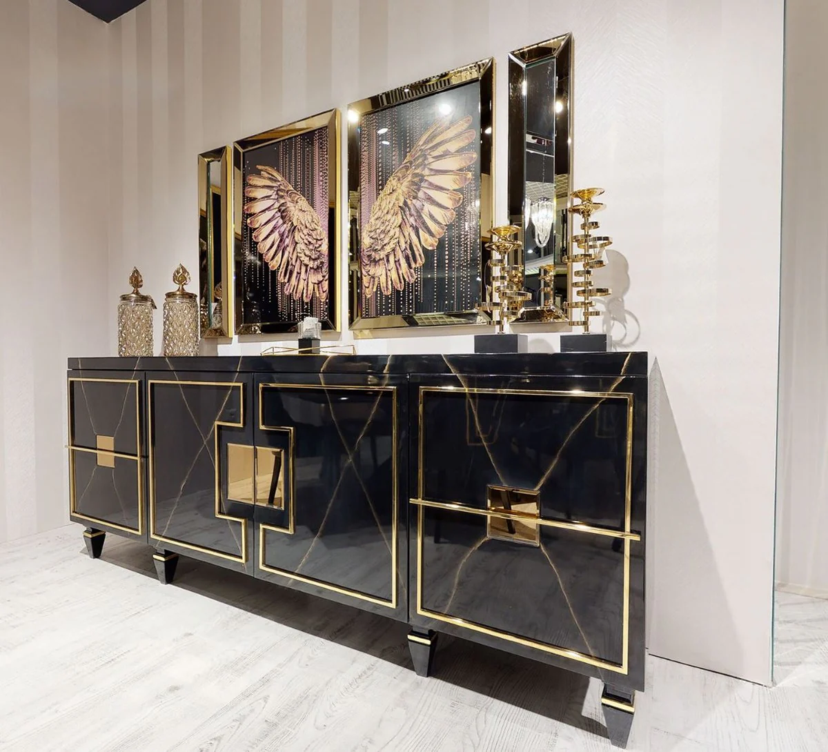 Casa Padrino aparador Art Deco de lujo negro / oro - Armario noble de madera maciza con 4 puertas - Muebles para Sal¨®n y Hotel Art Deco de Lujo