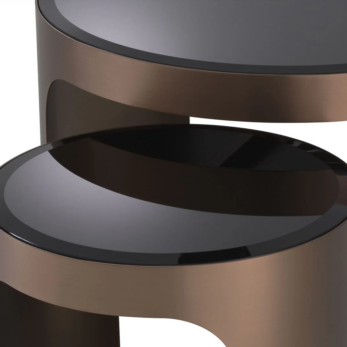 Casa Padrino conjunto de mesa auxiliar de lujo cobre / negro - 2 Mesas redondas de acero inoxidable con tapas de vidrio biselado - Muebles de sala de lujo