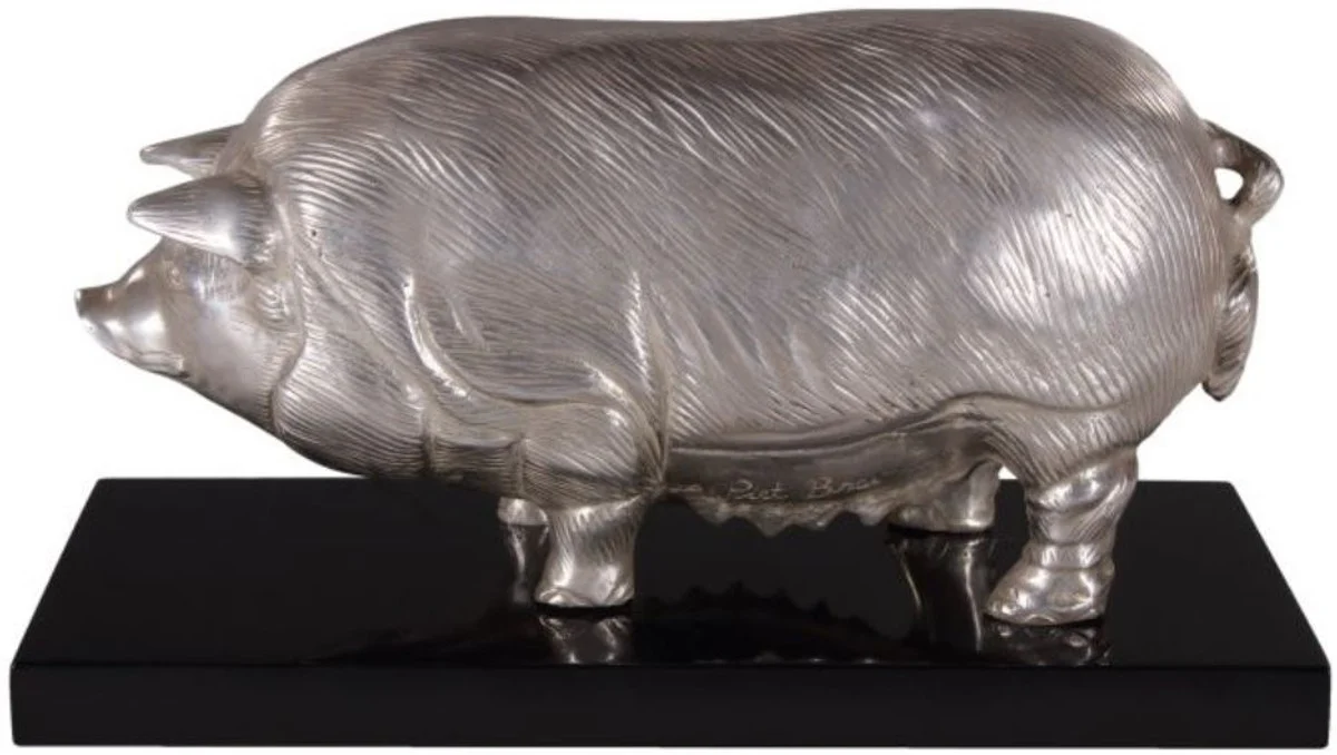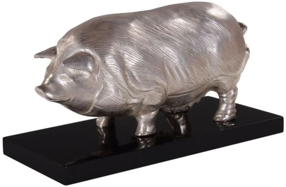 Casa Padrino figura de bronce de lujo cerdo sobre base de madera color plata / negro 35 x 17 x H. 19 cm - Figura de Decoración Plateada