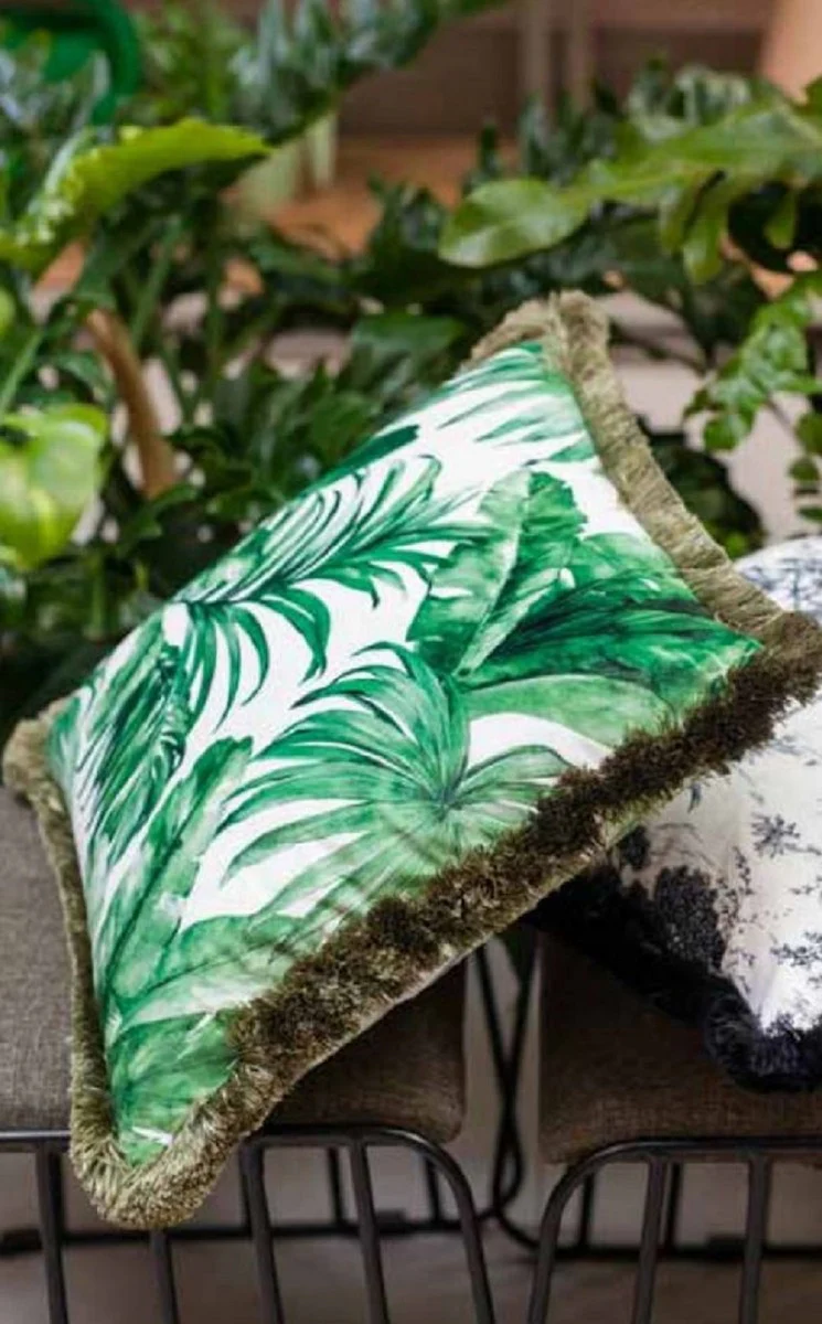 Casa Padrino almohada decorativa de lujo diseño hojas de palmera blanco / verde 45 x 45 cm - Almohada de terciopelo estampada con flecos - Decoración Salón