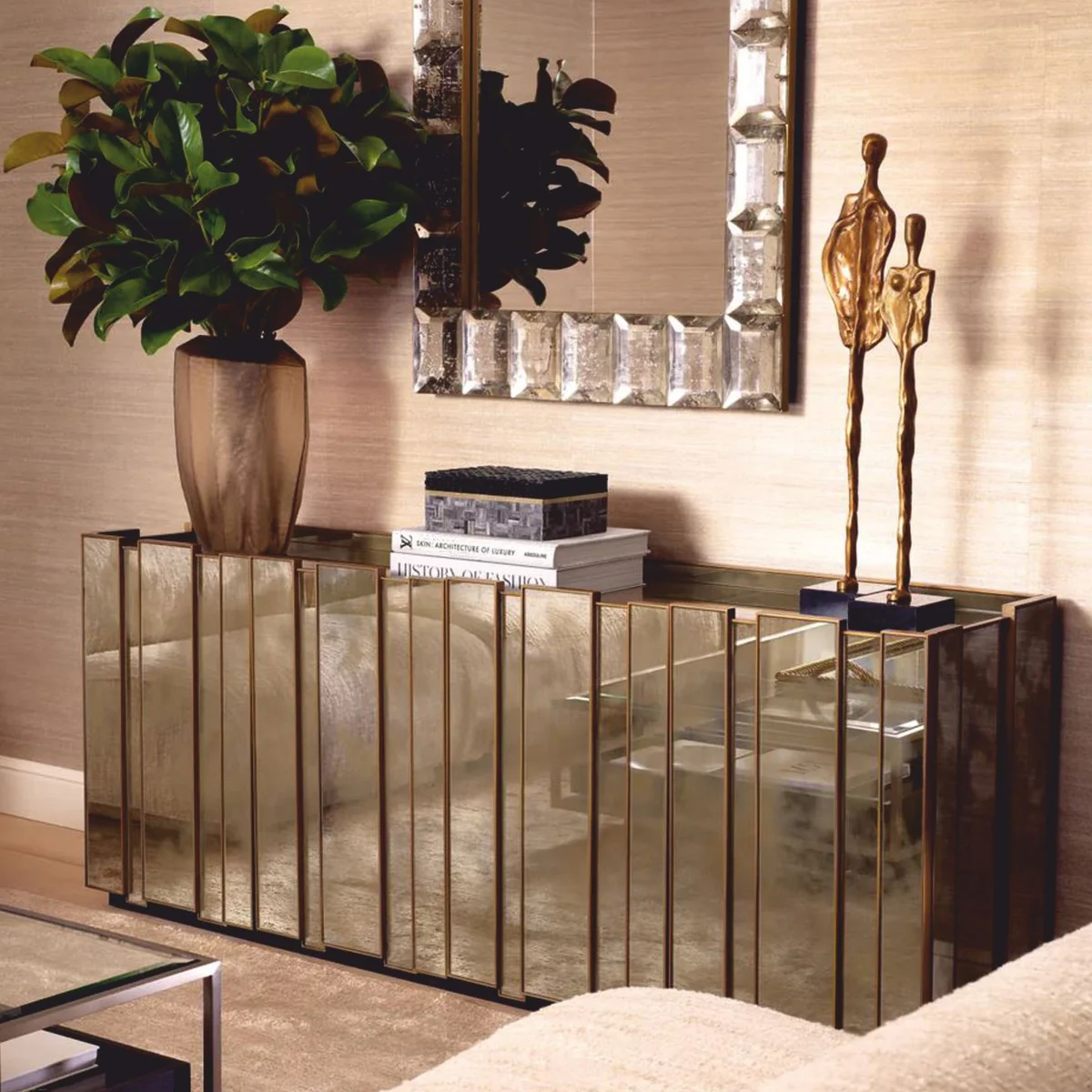 Casa Padrino - Mesa de centro de vidrio con espejo de lujo, 126 x 73.5 x H. 32 cm - Muebles de sala de lujo - Aspecto antiguo