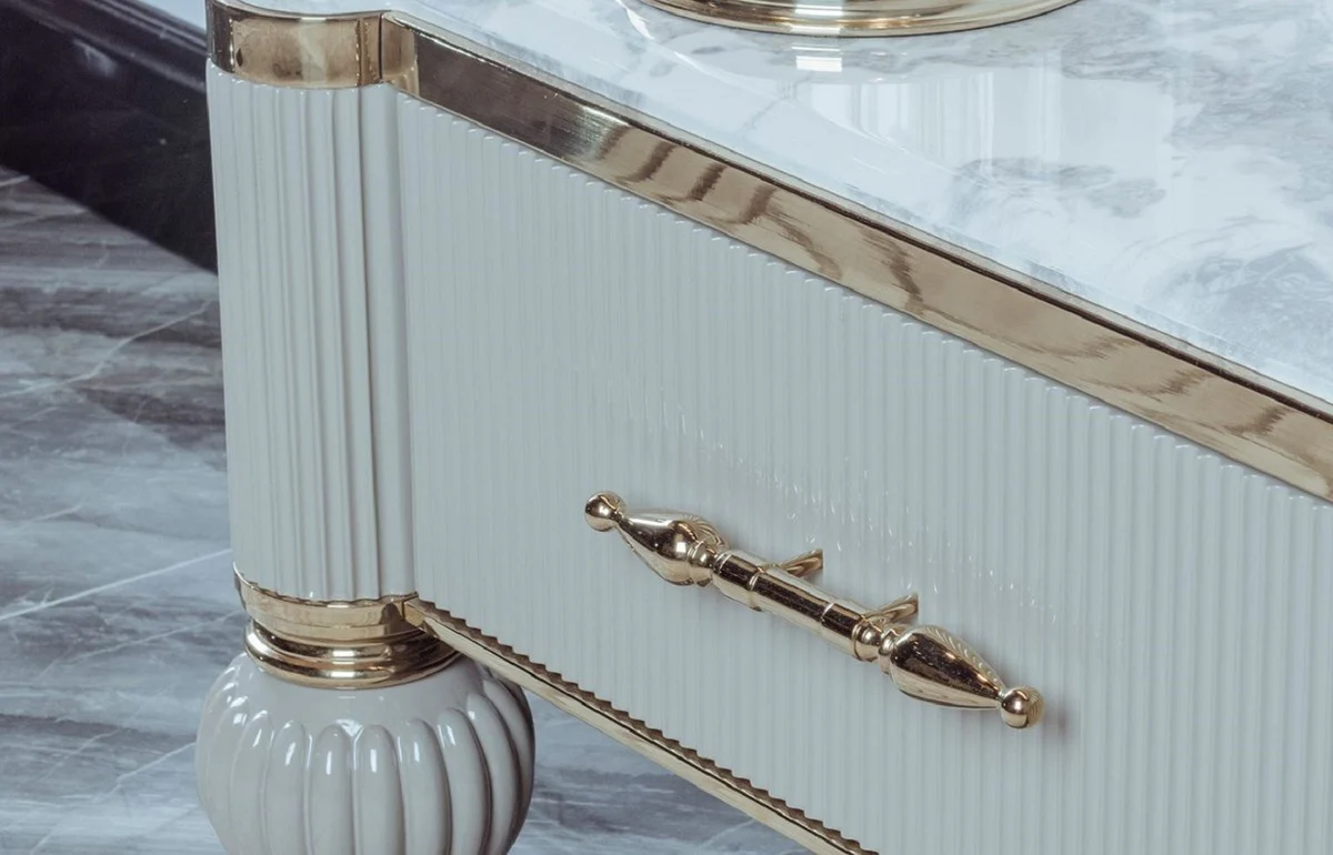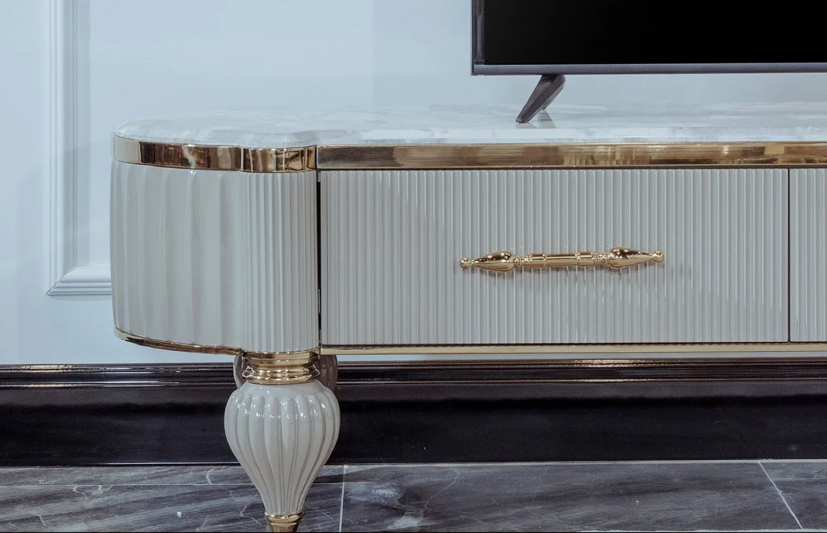 Casa Padrino gabinete TV Art Deco de lujo blanco / gris / oro 246 x 60 x A. 56 cm - Aparador de madera maciza con tapa de m¨¢rmol artificial - Muebles de sal¨®n Art Deco - Muebles de sal¨®n de lujo