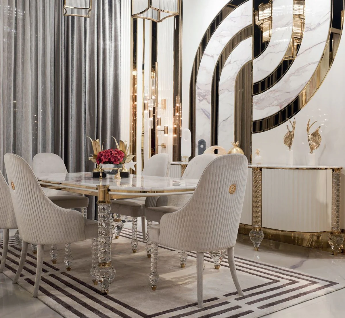 Casa Padrino aparador Art Deco de lujo gris / blanco / oro 235 x 54 x A. 90 cm - Gabinete noble de madera maciza con 4 puertas y tapa de m¨¢rmol artificial - Muebles Art Deco - Calidad de Lujo