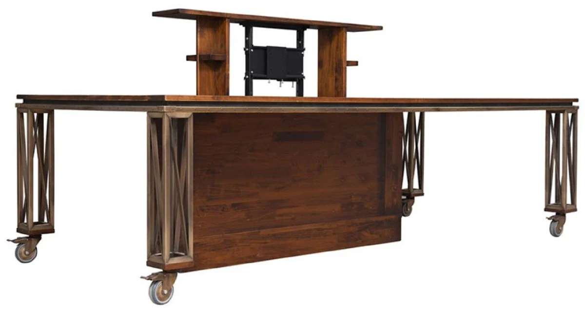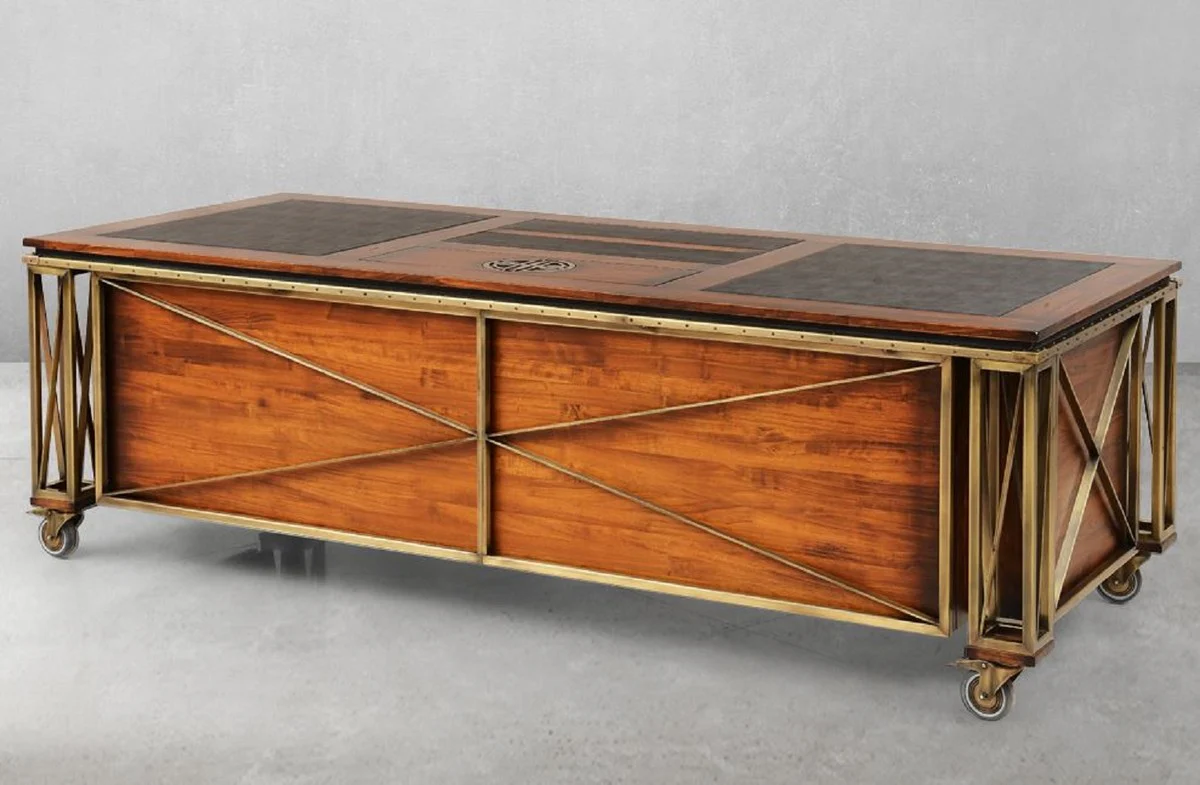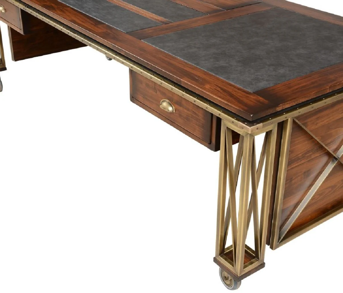 Casa Padrino escritorio de estilo vintage de lujo marrón / latón / negro 270 x 120 x A. 76 cm - Mesa de oficina de madera maciza con ruedas - Muebles de oficina estilo vintage