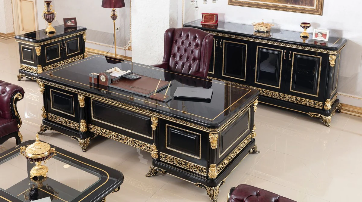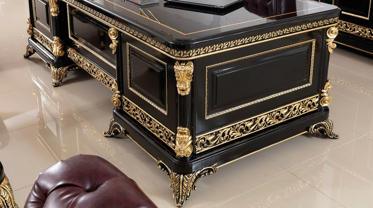 Casa Padrino conjunto de muebles de oficina barrocos de lujo rojo burdeos / negro / oro - 1 Escritorio Barroco con y 1 Silla de Oficina Barroco Chesterfield con Cuero Artificial Fino