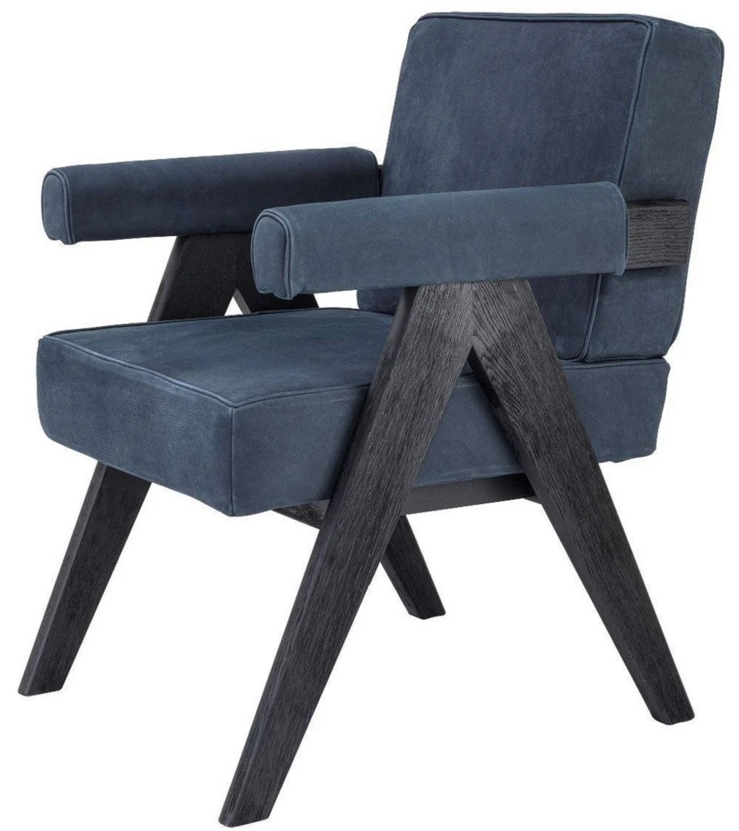 Casa Padrino silla de comedor de piel genuina de lujo con reposabrazos azul / negro 59 x 74 x A. 88 cm - Silla de cocina con cuero de b¨²falo nobuck fino - Muebles de comedor de lujo