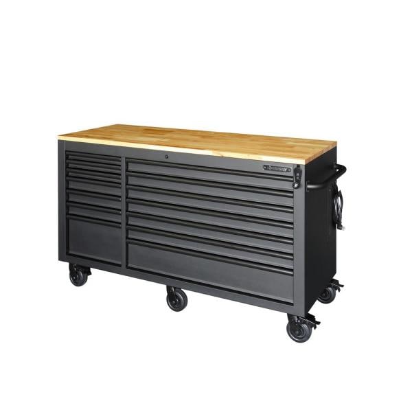 HEAVY-DUTY 62 IN. W 14-DRAWER, DEEP TOOL CHEST MOBILE WORKBENCH IN MATTE BLACK WITH ADJUSTABLE-HEIGHT HARDWOOD TOP
